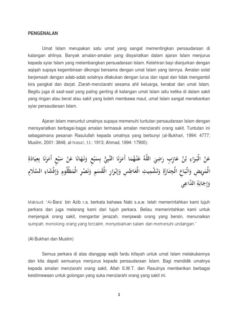 Dipublikasi pada 21 mei 2010 oleh wongalus. Menziarahi orang sakit tidak hanya terbatas kepada sahabat atau jiran tetangga yang sakit sahaja, bahkan disunatkan juga menziarahi saudara islam yang tidak dikenali hatta musuh atau orang yang pernah menyakiti kita. Sesungguhnya menziarahi orang sakit adalah sunat muakkadah iaitu sunat. Di antara hadith yang menganjurkan umat islam untuk menziarahi orang sakit adalah seperti berikut: Amalan menziarahi orang sakit adalah hak yang mesti ditunaikan buat orang yang sihat.
